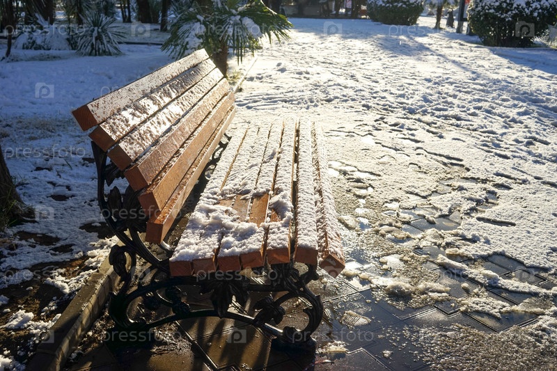 Зимние каникулы в парке, снег на деревянной скамейке