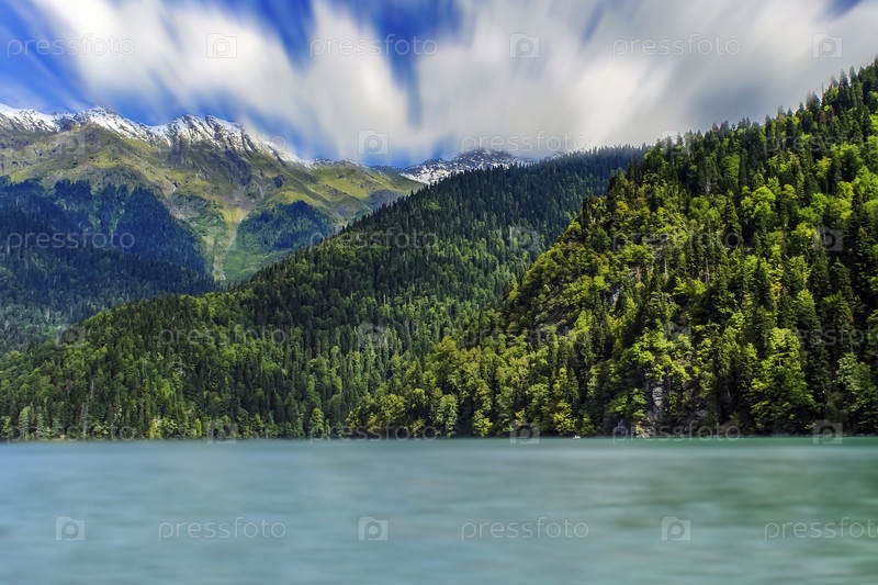 Рица, Абхазия. Великолепный горный пейзаж на фоне изумрудного озера Рица в Абхазии