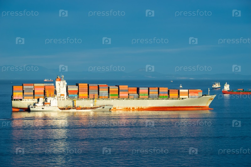 Морской пейзаж с большим контейнеровозом на фоне моря. Владивосток, Россия