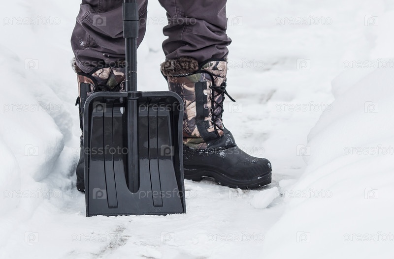 Очистка от снега. Ноги и лопата крупным планом. Уборка улиц
