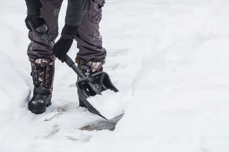 Очистка от снега. Ноги и лопата крупным планом. Уборка улиц