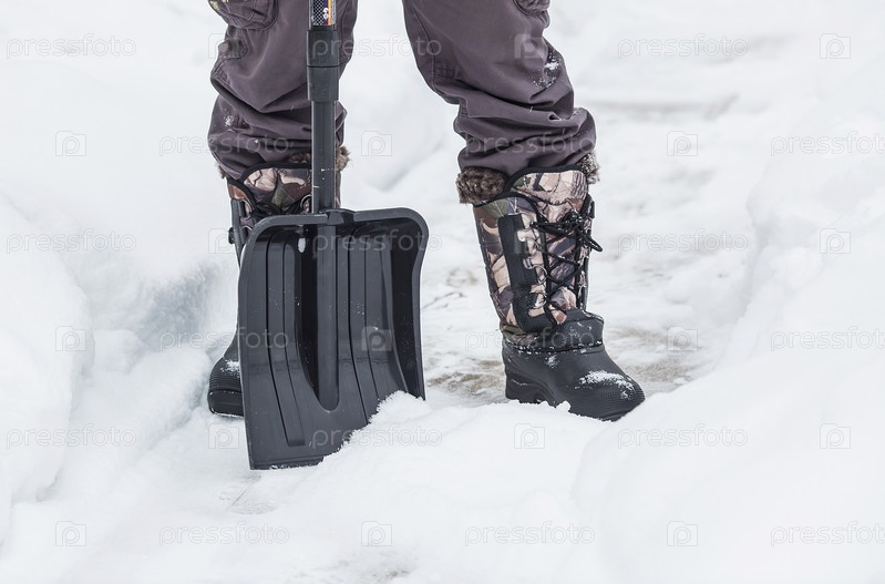 Очистка от снега. Ноги и лопата крупным планом. Уборка улиц