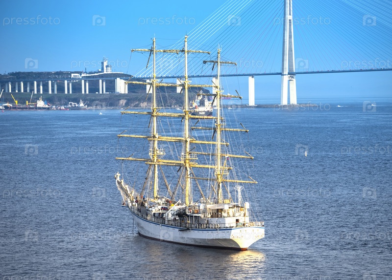 Владивосток, Россия. Морской пейзаж с красивым парусником на фоне русского моста