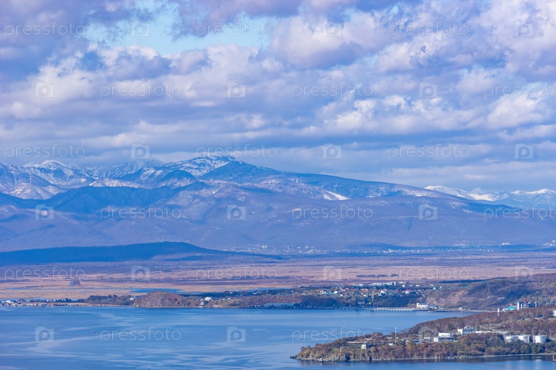 Морской пейзаж с видом на горы. Петропавловск-Камчатский, Россия