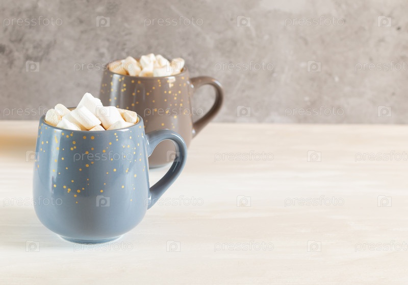 Две чашки какао с зефиром на светлом фоне с копией пространства справа. Крупный план, вид сбоку, горизонталь