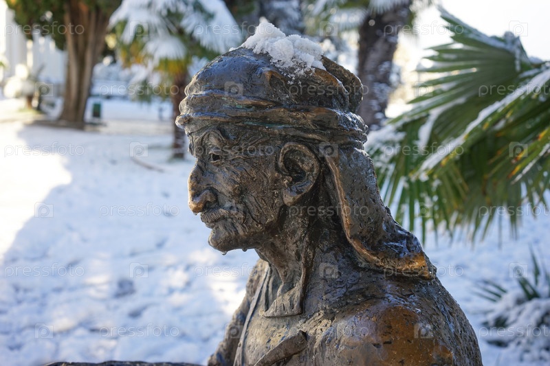 Городской пейзаж со скульптурой на фоне снега и пальм