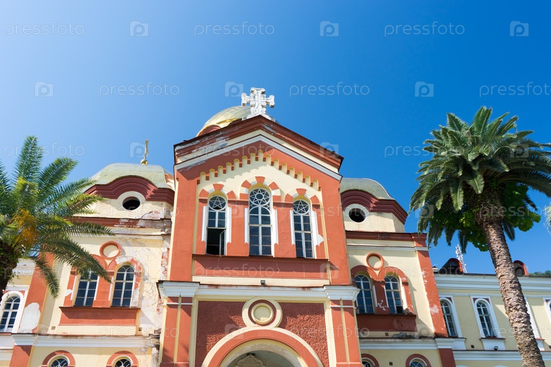 Новый Афон, Абхазия-29 июля 2014 г.: Архитектура древнего монастыря на фоне голубого неба