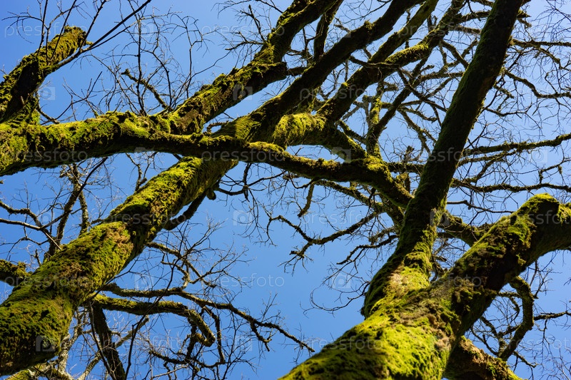 Естественный фон со стволами деревьев, покрытыми ярко-зеленым мхом