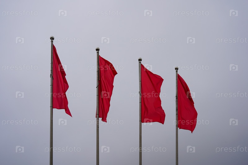Красные флаги на фоне туманного неба