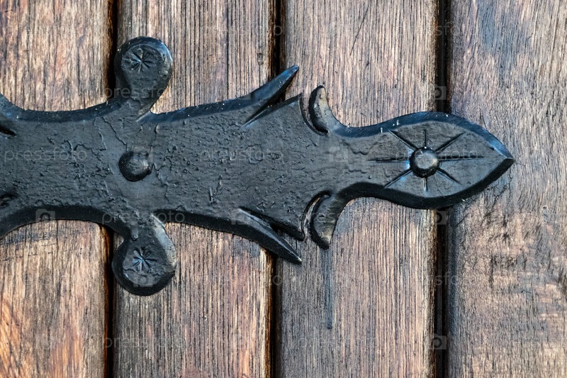 Декоративный элемент из черного металла на деревянных дверях