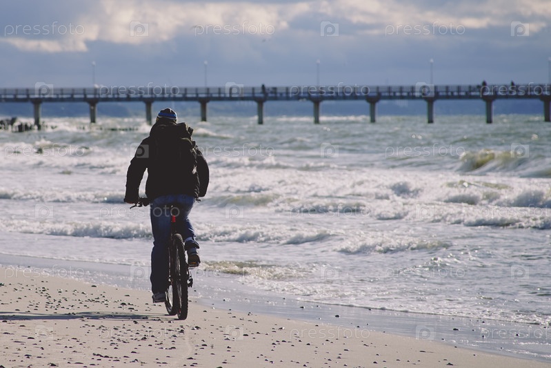 Одинокий велосипедист в темной одежде едет по песчаному пляжу к пирсу