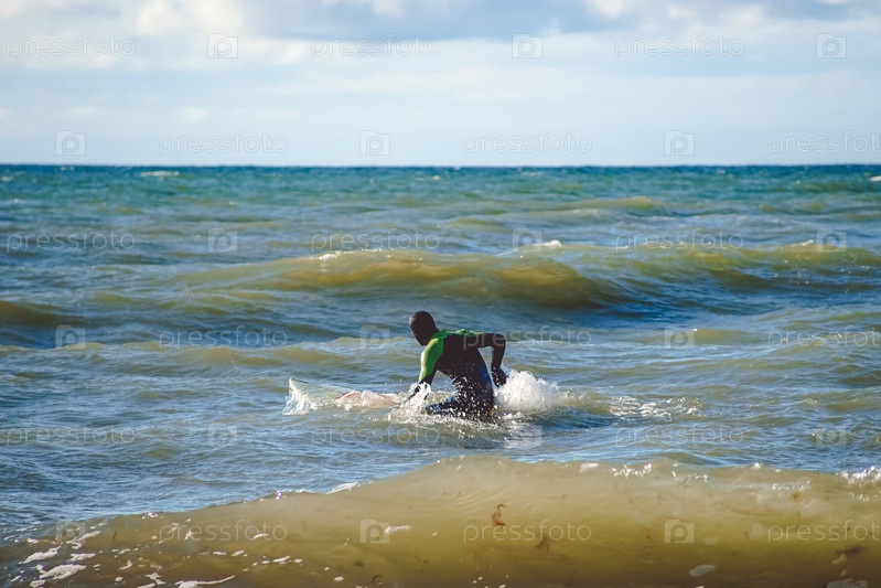 Одинокий серфер тренируется на небольших волнах в Балтийском море