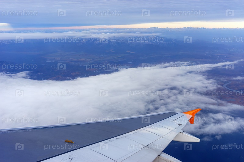 Крыло самолета на фоне пейзажа с облаками и вулканами. Камчатка
