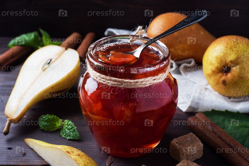 Домашнее грушевое варенье в банке и свежие груши на деревянном фоне