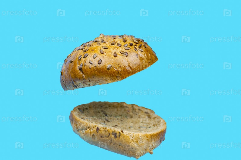 Ржаная булочка для бургера из двух частей в состоянии левитации на синем фоне