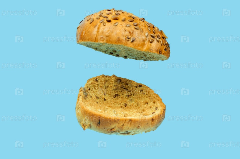 Ржаная булочка для бургера из двух частей в состоянии левитации на синем фоне
