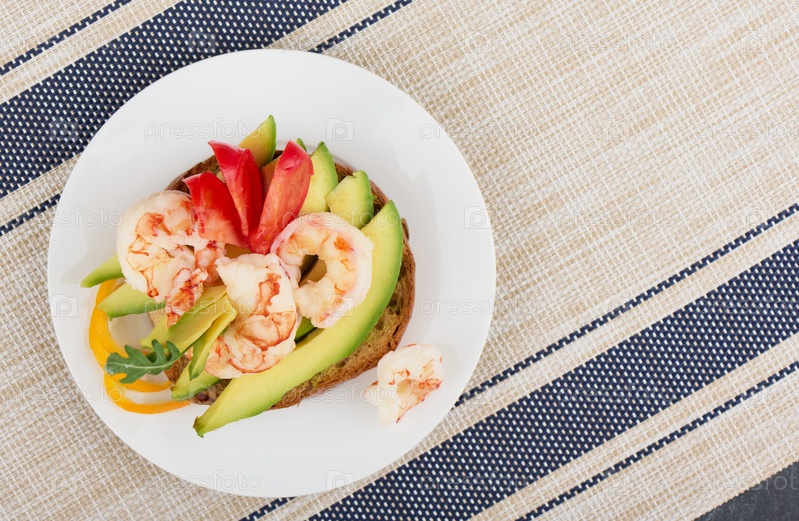 Небольшой бутерброд на ржаной булочке с авокадо, креветками и помидорами, вид сверху, неглубокая глубина резкости