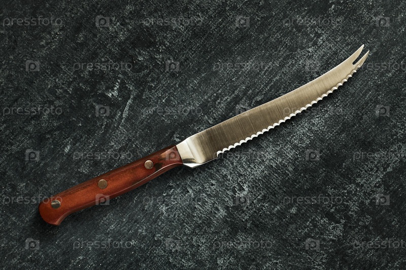 Специализированные повара кухонный томатный нож на сером фоне гранж, крупным планом, вид сверху