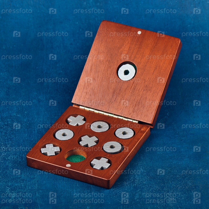 Настольная игра Tic Tac Toe в деревянной коробке на синем фоне, неглубокая глубина резкости