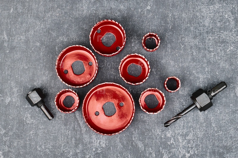 Вид сверху на пилы для распиловки отверстий в древесине, серый фон