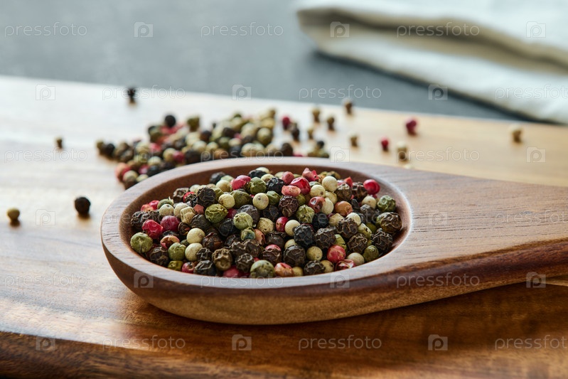 Разнообразие цветных перцев на деревянной ложке, специи, макросе
