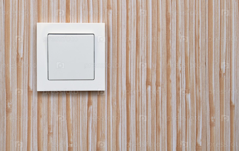Белый выключатель электрического света на фоне пластиковой стены ПА