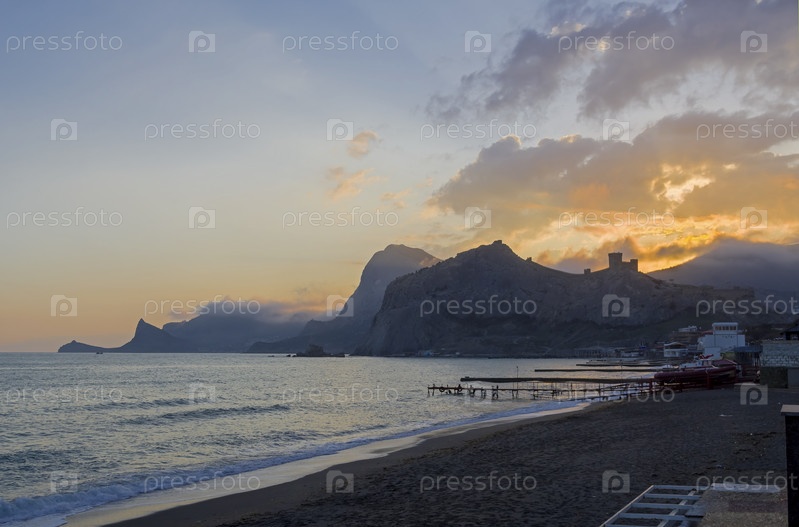 Вечер в Судакской бухте. Вид с пустого пляжа в сторону поселка Новый Свет. Крым, конец апреля