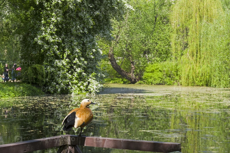 Старый заросший пруд в парке. Утка-огарь сидит на перилах маленького мостика. Аптекарский Огород (филиал ботанического сада МГУ). Москва. Солнечный день в середине мая