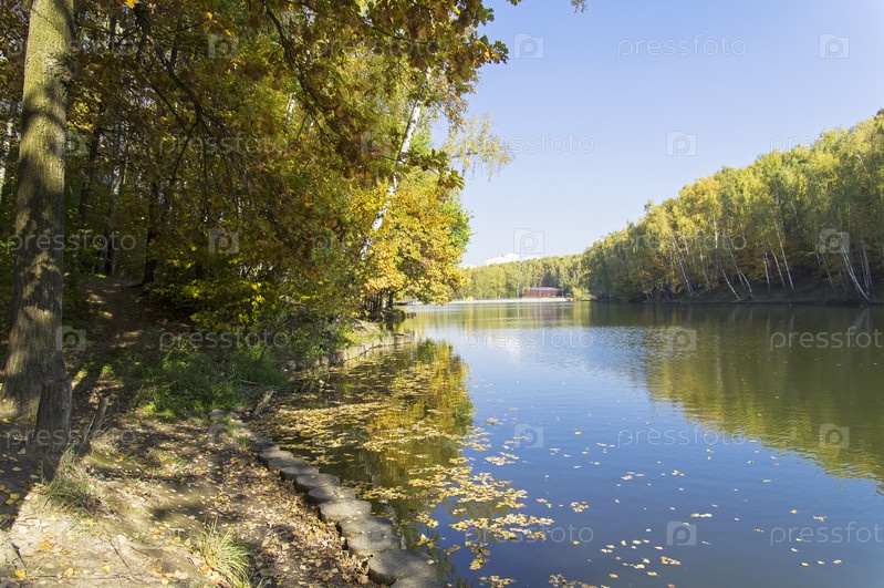 Красивый осенний пейзаж - деревья с желтой осенней листвой на берегу пруда. Теплостановский лесопарк, Москва. Солнечный день в октябре