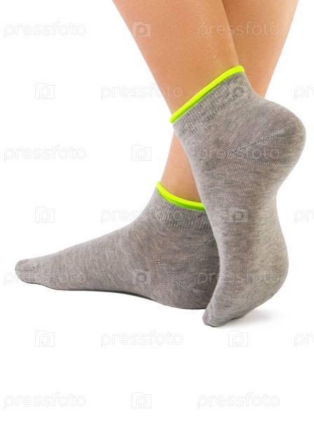 Вид сбоку на красивую женскую ногу, одетую в новые красивые и мягкие натуральные хлопчатобумажные ткани, пустые серые носки с светло-зеленой окантовкой на белом фоне. Концепция ношения и спортивной одежды. Подробная студийная съемка крупным планом