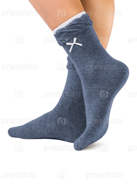 Вид сбоку на красивую женскую ногу, одетую в новые красивые и мягкие чистые синие носки из натуральной хлопчатобумажной ткани со светло-серой окантовкой