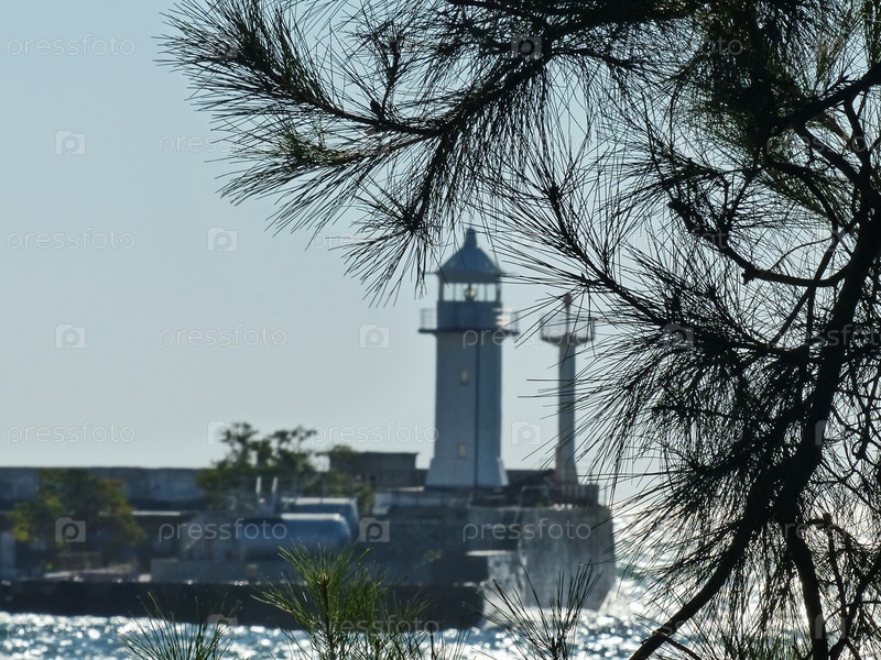 Ветка крымской сосны на фоне маяка. Вечерние сумерки, прогулка по набережной Ялты