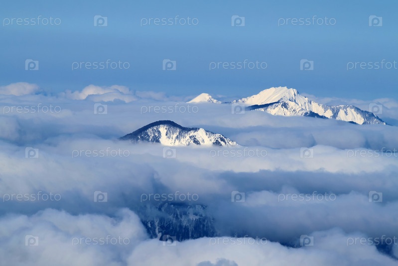 Снежные вершины гор торчат из пушистых облаков. На заднем плане ясное голубое небо. Зимний пейзаж