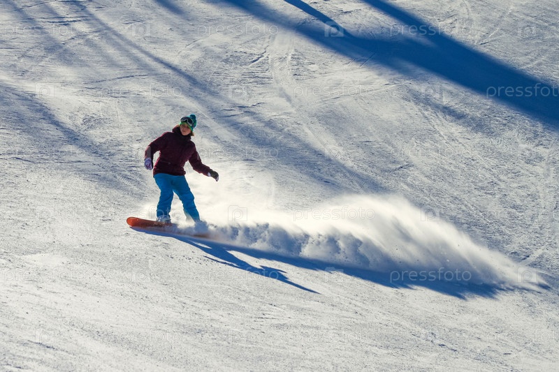 Женщина мчится вниз по горнолыжному склону на сноуборде. Из-под доски вылетает красивый шлейф снега. На склоне длинные тени. Активный отдых во время зимних каникул