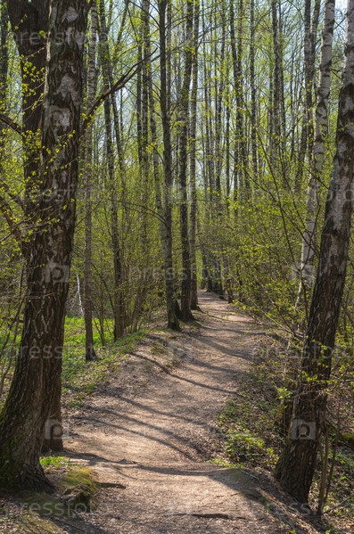 Тропинка в весеннем лесу. Теплостановский лесопарк, Москва. Солнечный день в начале мая