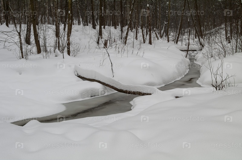 Незамерзающий ручей в зимнем лесу. Конец февраля. Битцевский лес, Москва. Верховья реки Чертановка