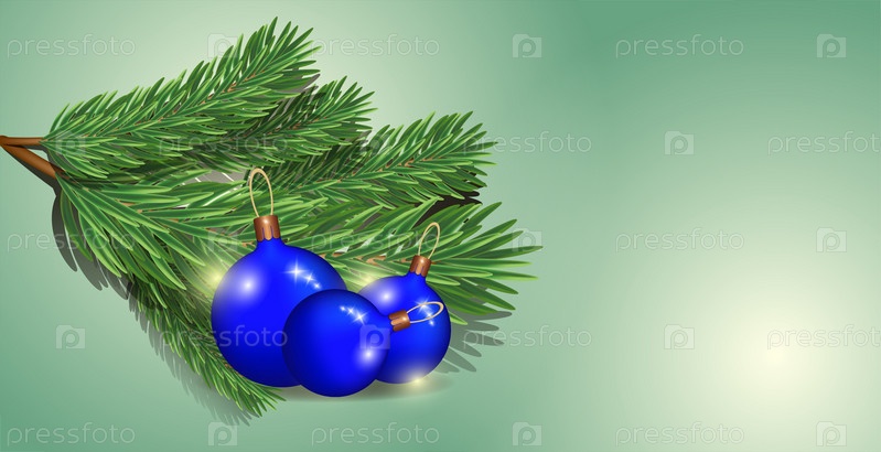 Еловая ветка с голубыми елочными шарами на изолированном фоне. Шаблон для текста, элементы дизайна, места для копирования, открытки, социальные сети, обложки, баннеры. Новый год и Рождество