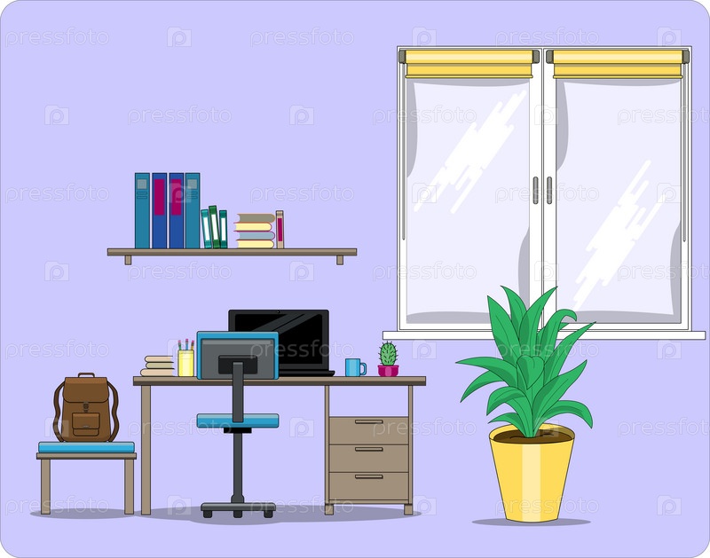 Концепция рабочего места для студента или школьника. Офисный стол. Дизайн для совместной работы. Рабочий стол с компьютером, папками и кофейной кружкой