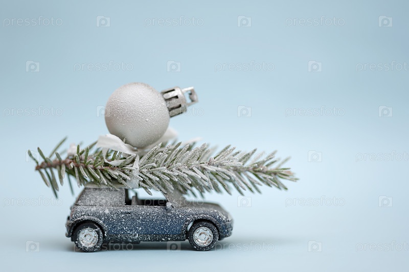 Новогодняя елка на игрушечной машинке на голубом фоне. Новогодняя и Рождественская открытка