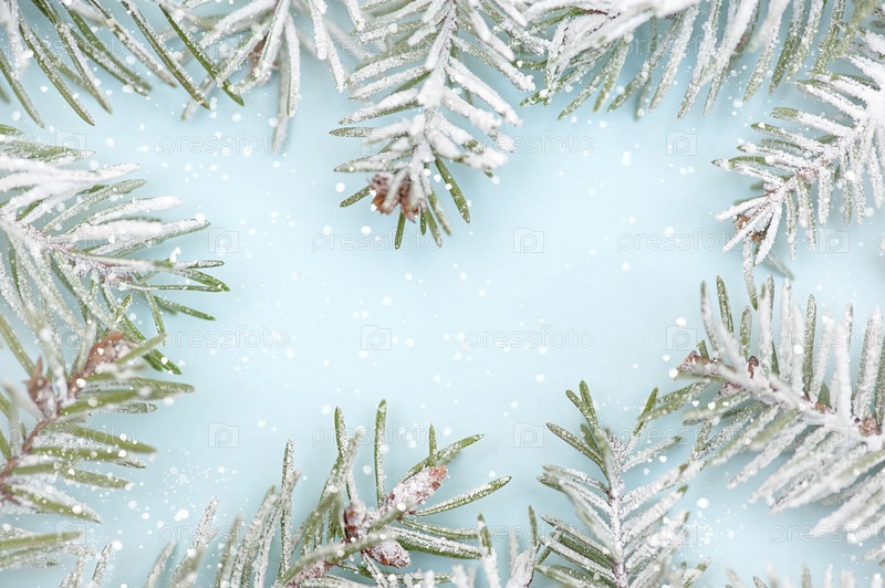 Рождественские еловые ветки в снегу на синем фоне. Место для текста