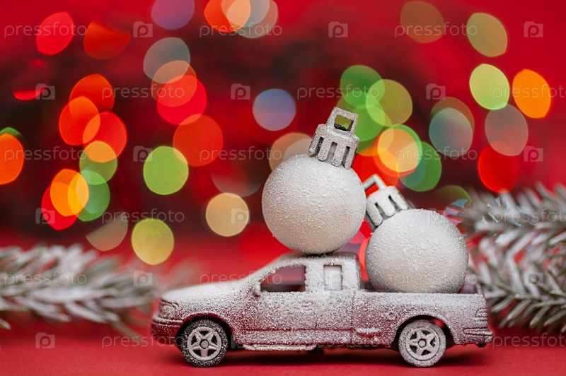 Заснеженная игрушечная машинка с елочными шарами на красном фоне боке Рождественская концепция