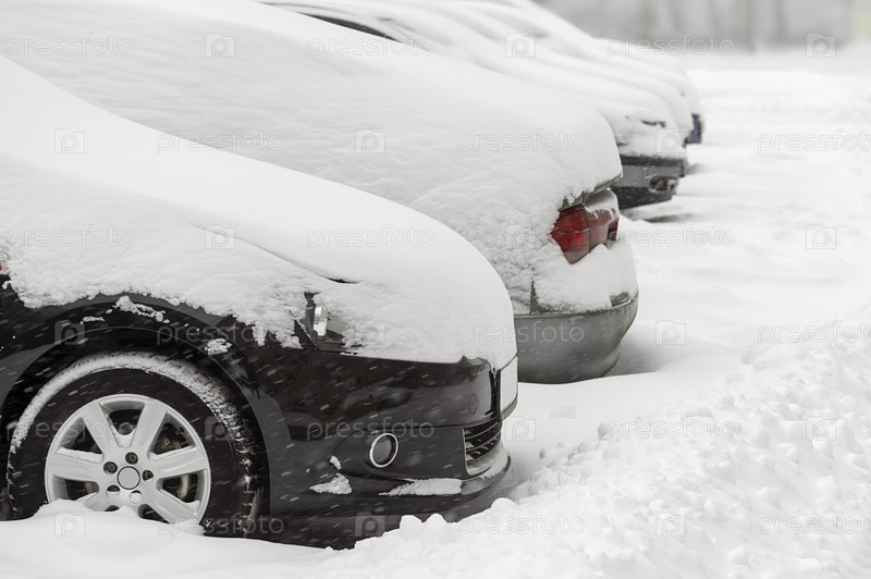 Ряд припаркованных автомобилей, покрытых снегом. Крупным планом