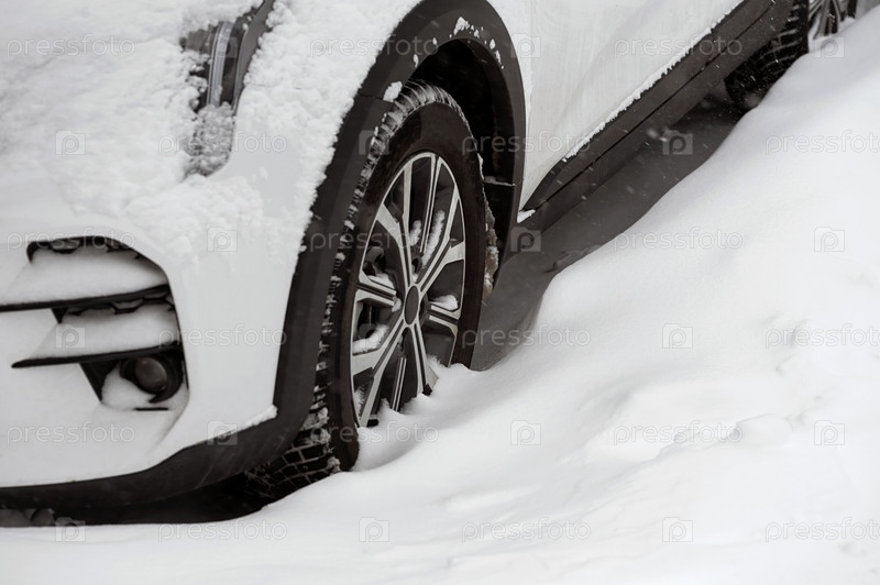 Колесо автомобиля в сугробе, холодный зимний день