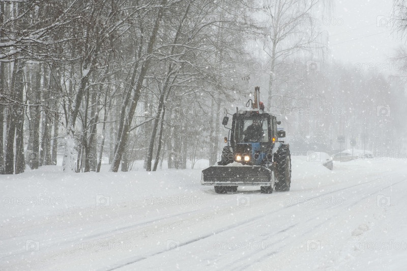 Трактор убирает снег. Коммунальная служба очищает тротуар от снега снегоочистителем