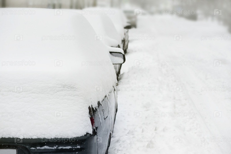 Ряд заснеженных машин и зимняя дорога. Место для текста. Снегопад