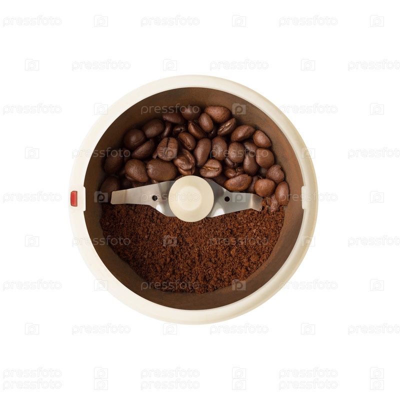 Вид сверху на кофемолку с половинками целых и молотых зерен