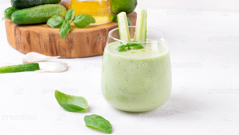Зеленый гаспачо со свежим огурцом, йогуртом, зеленью, чесноком и оливковым маслом подается в стакане. Испанский холодный суп