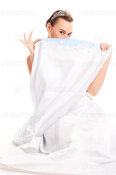 Портрет очаровательной девушки в белом платье, изолированный на белом фоне