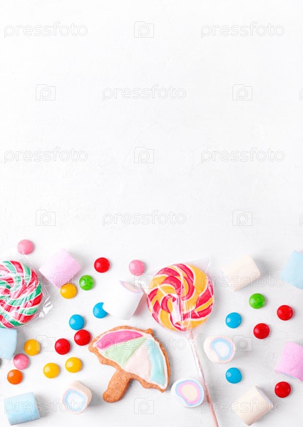 Плоская лежала с ассортиментом сладостей на белом. Леденцы, зефир, печенье-зонтик и леденцы. Копировать пространство