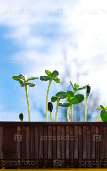 Микрозелень подсолнечника растет на балконе на фоне голубого неба в солнечный день. Проращивание зелени в домашних условиях